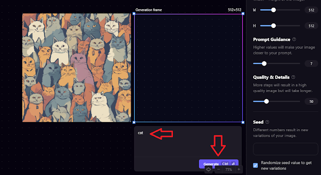 登入後,只需要在Generation frame下方的框輸入文字,然後按下Generate,大約等10秒就會自動生成圖片。(中文沒有效果,必須要英文)